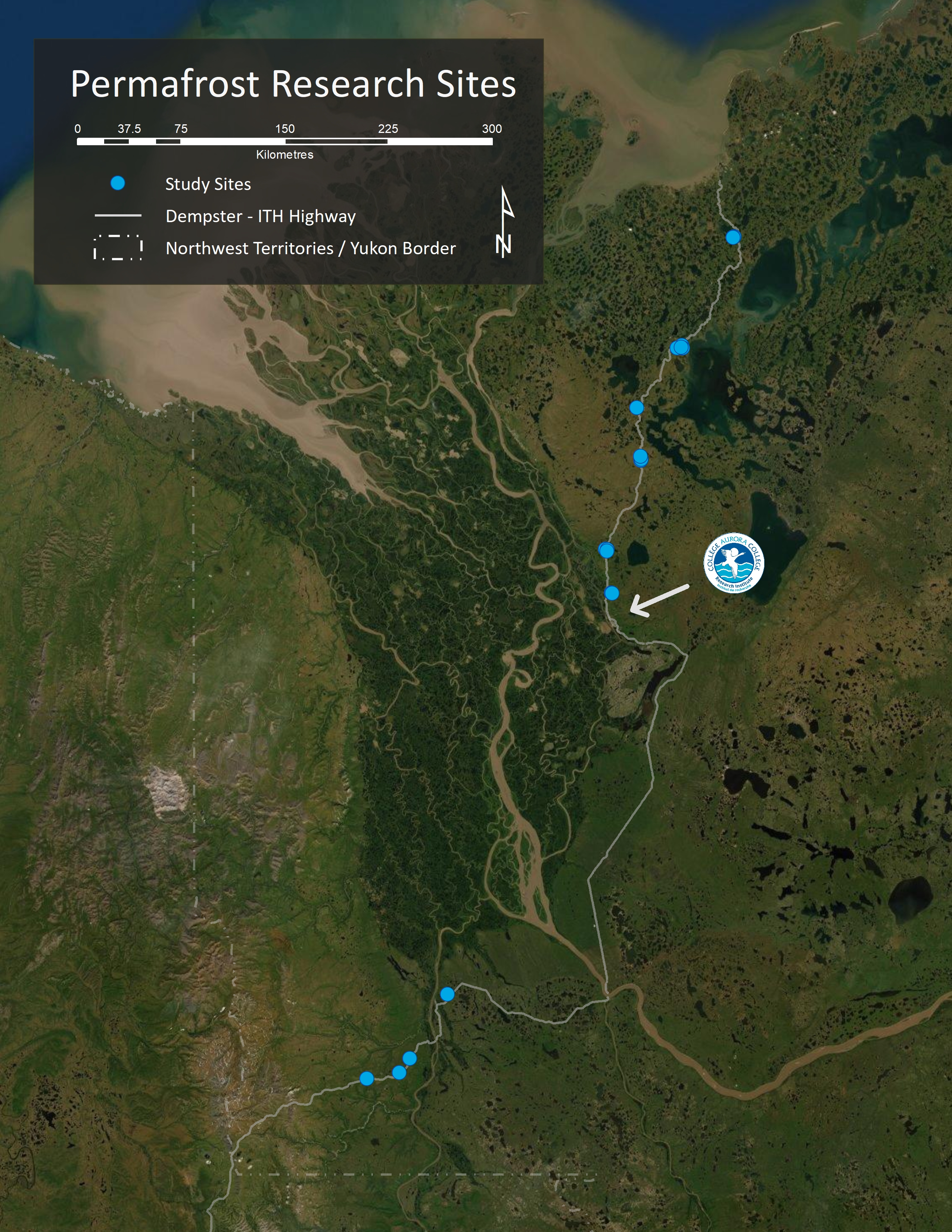 The permafrost data consolidation is along Dempster- Inuvik Tuktoyaktuk Highway (ITH) corridor. Field work and research sites are located near the Dempster and ITH from the border to Tuktoyaktuk. Snow manipulation locations are paired with established permafrost monitoring sites located along the ITH. Currently working toward establishing monitoring sites with communities.