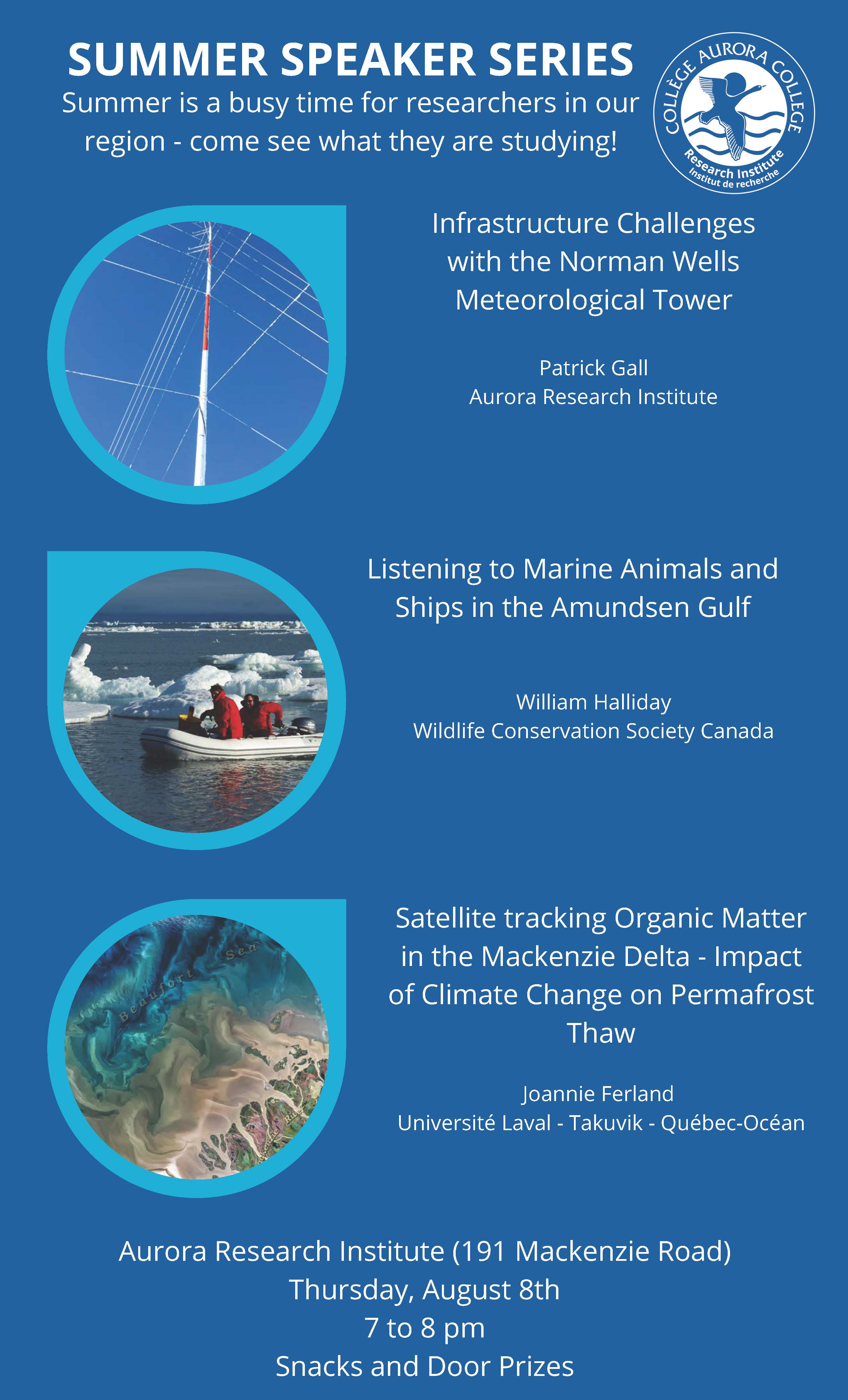 The fifth summer series talk will be on Thursday, August 8th from 7-8 pm at the Aurora Research Institute in Inuvik. We have three speakers.
