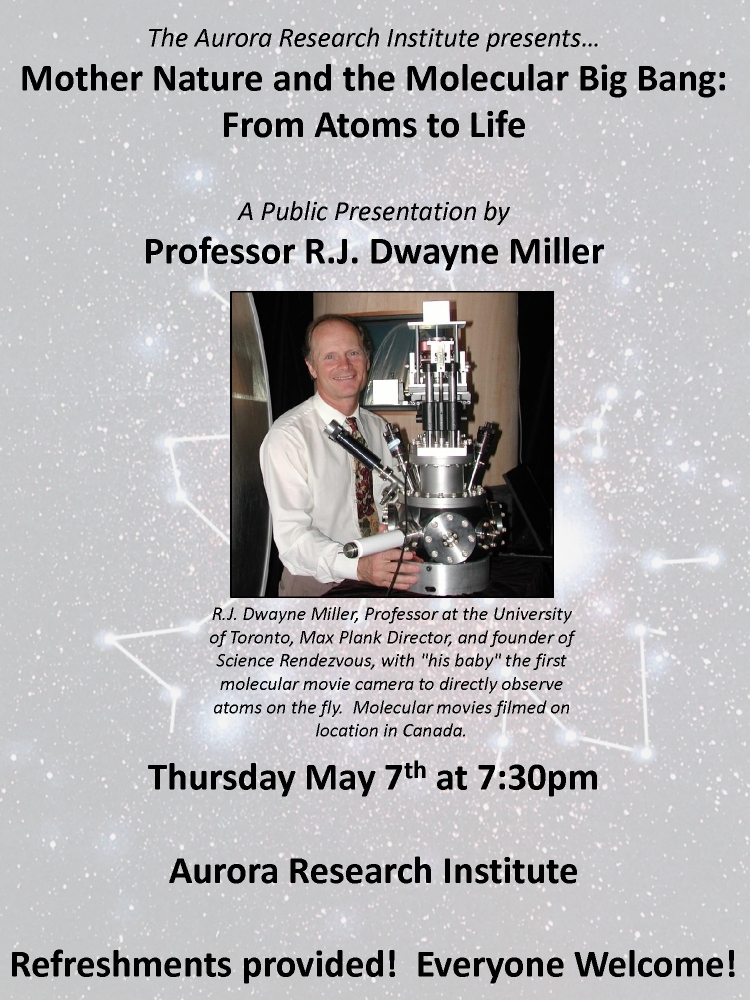 Please join us for a presentation by Professor R.J. Dwayne Miller entitled, "Mother Nature and the Molecular Big Bang: From Atoms to Life". The presentation will take place at the Aurora Research Institute in Inuvik on Thursday May 7th at 7:30pm.