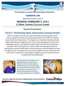 F.O.X.Y. (Fostering Open eXpression among Youth) is an arts-based program and participatory action research project that introduces a new way of talking with northern youth about sexual health, sexuality and relationships. By enabling self-expression through theatre, digital storytelling and other arts, FOXY helps youth build greater self-confidence for healthy and empowered decision-making. (For more info, please visit their website: […]