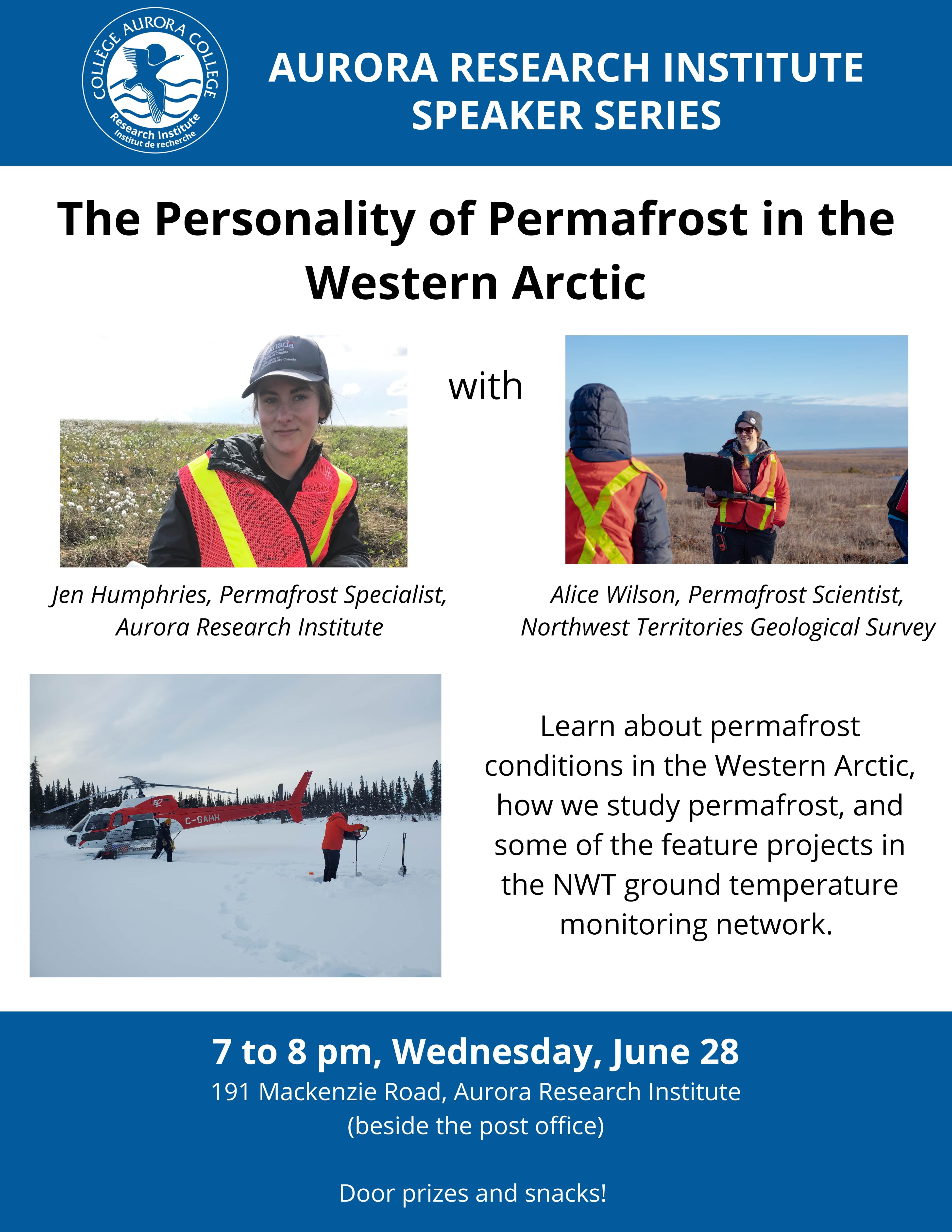 This June 28th, Aurora Research Institute invites you to join our next speaker series event, "The Personality of Permafrost in the Western Arctic". Hosted at the Western Arctic Research Centre (191 Mackenzie Road, right next to the post office), the event will be held from 7 PM to 8 PM and will offer a fascinating deep dive into the world of permafrost.