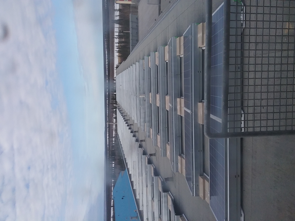 A panoramic view of the solar wall (right) and Fronius PV install (left) on the roof of WARC