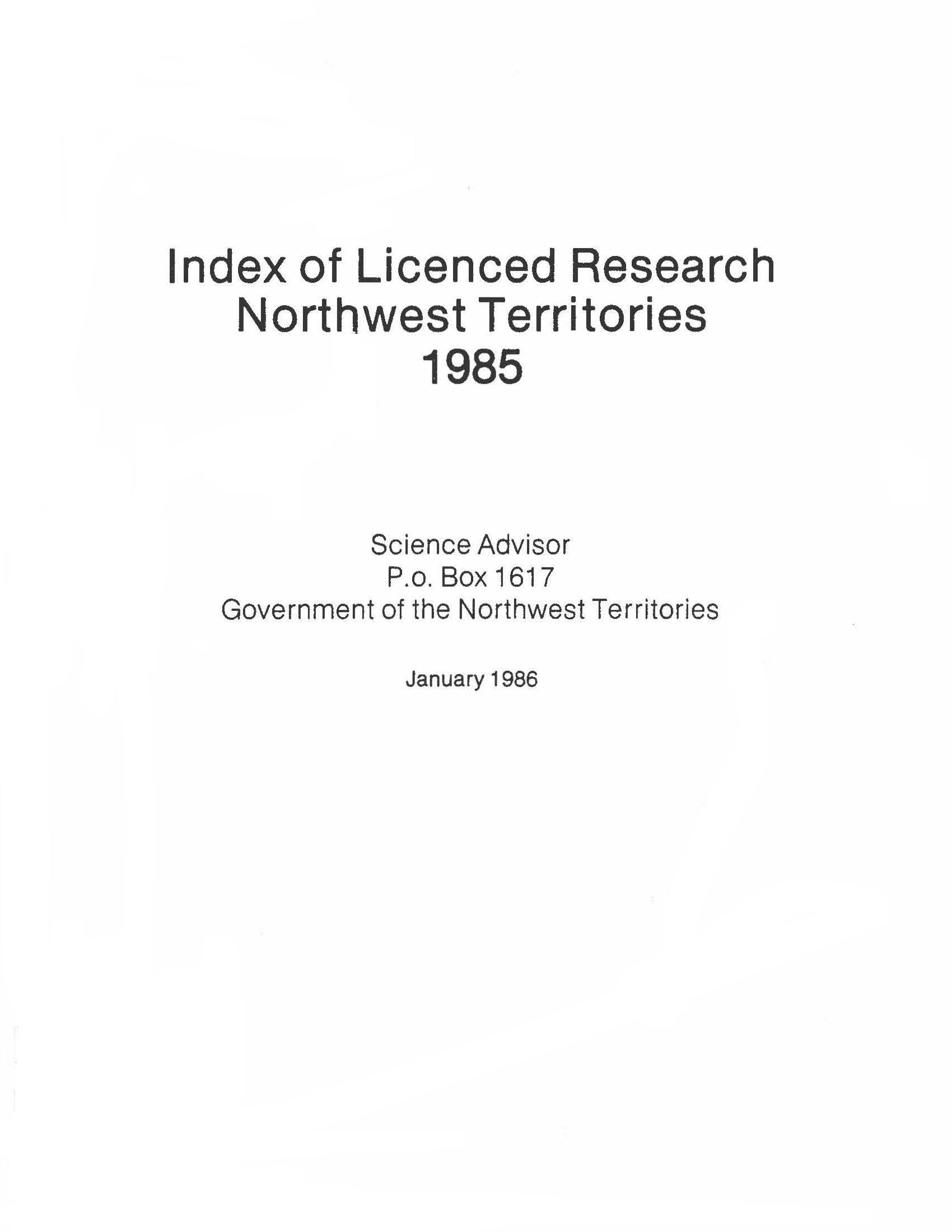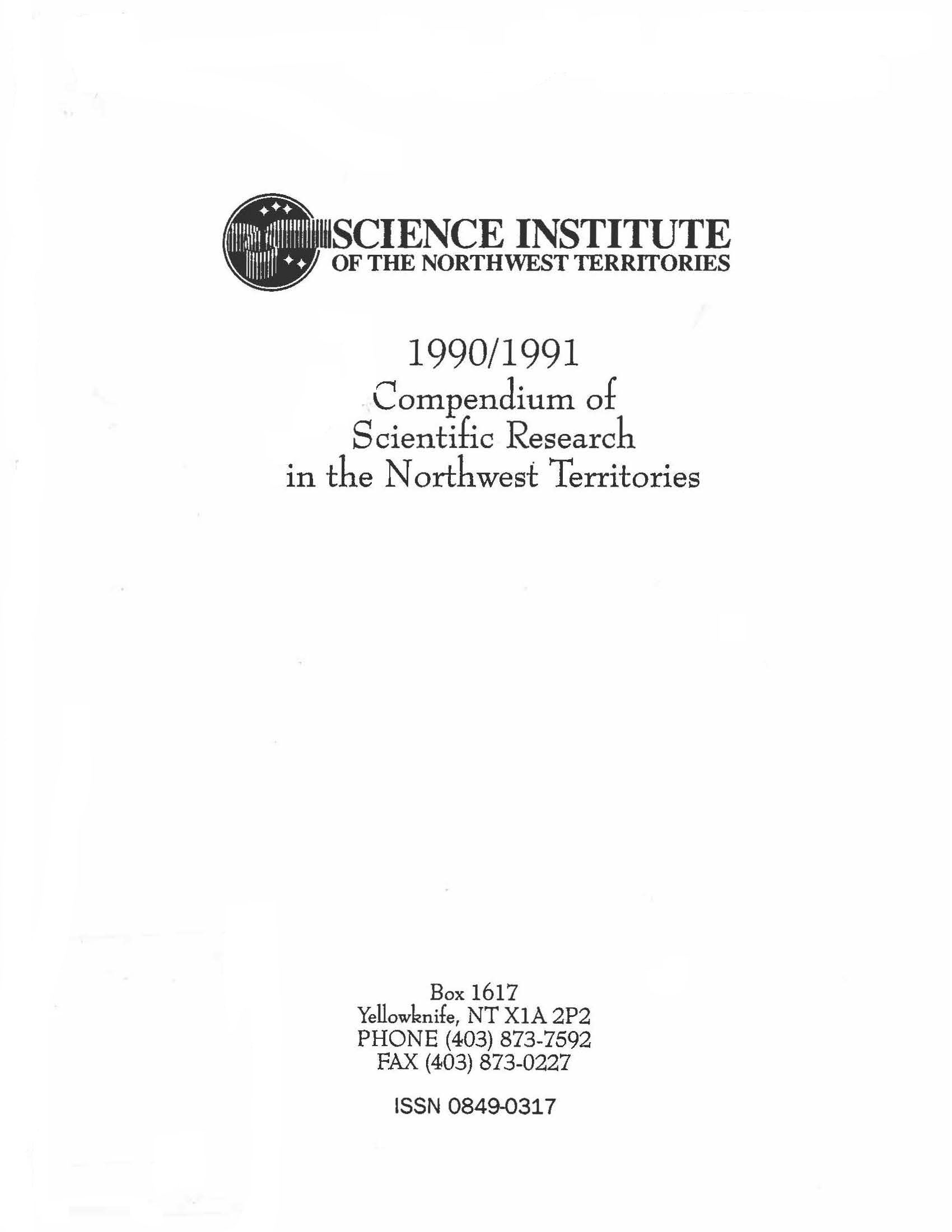 The Compendium of Research in the NWT  is an annual publication that offers summaries of research licences/permits that were issued in the Northwest Territories. The information contained in this book is a product of collaboration between the Aurora Research Institute, the Prince of Wales Northern Heritage Centre, the Department of Environment and Natural Resources and the Department of Fisheries and Oceans. The Compendium series began in 1984.